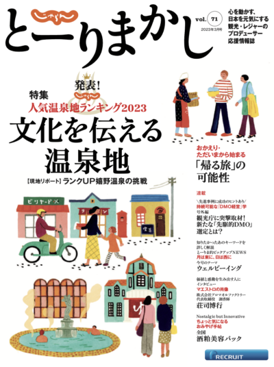 「とーりまかしvol.71」に弊社代表を取り上げていただきました 2023年3月2日2023年3月2日 株式会社リクルート、じゃらんリサーチセンターが発行する季刊誌「とーりまかしvol.71」(2023年3月発行)に弊社代表を取り上げていただきました。 「とーりまかしvol.71」 【連載:価値と感動を生み出す人にインタビュー マエストロの肖像62】(P32) 「香りづくり」から「におい体験」へ香りの可能性に挑む新時代の調香師